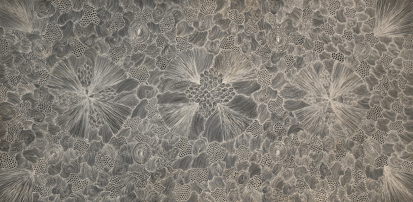 L’artiste a composé ses toiles de façon très subtile en faisant usage d’un vocabulaire iconographique très riche. En effet, des myriades de pointillés jouxtent des cercles concentriques eux-mêmes entourés de lignes très fines de peinture blanche subtilement apposées sur la toile à l’aide d’une aiguille sortant d’une bouteille de peinture. Bien qu’elle ait été formée par les plus grandes artistes aborigènes, Annie Petyarre a créé un style organique totalement unique. Ses toiles incarnent l’énergie de l’éclosion des fleurs, symbole de fertilité par excellence.